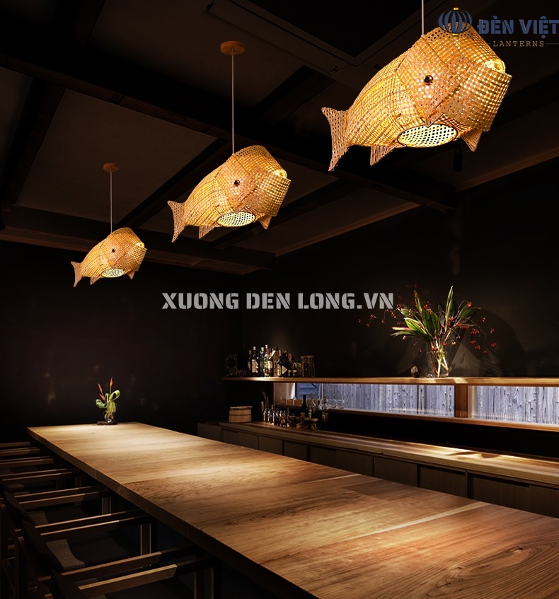 Đèn mây tre DTRE01 hình con cá được làm bằng chất liệu khung sắt, bọc mây hoặc vải ( tùy theo yêu cầu của quý khách hàng).